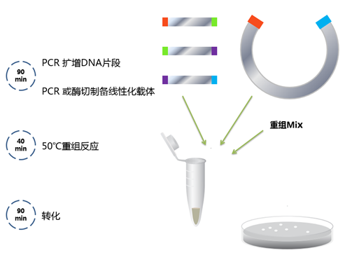 重組MIX是一款簡單、快速、高效的多片段DNA定向克隆產(chǎn)品,本試劑盒可以將PCR產(chǎn)物定向克隆至任意載體的任意位點。將載體在克隆位點進(jìn)行線性化,并在插入片段PCR引物5’端引入線性化克隆載體末端序列,使得插入片段PCR產(chǎn)物5’和3’最末端分別帶有和線性化克隆載體兩末端對應(yīng)的完全一致的序列(20 bp40 bp)。將這種兩端帶有載體末端序列的PCR產(chǎn)物和線性化克隆載體按一定比例混合,在重組酶的催化下,僅需反應(yīng)15-60 min即可進(jìn)行轉(zhuǎn)化,完成定向克隆。克隆陽性率可達(dá)90%以上。